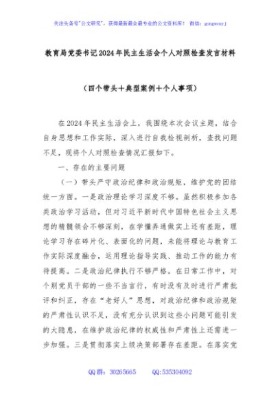 / 教育局党委书记2024年民主生活会个人对照检查发言材料(四个带头+典型案例+个人事项)