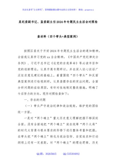 / 某纪委副书记、监委副主任2024年专题民主生活会对照检查材料(四个带头+典型案例)