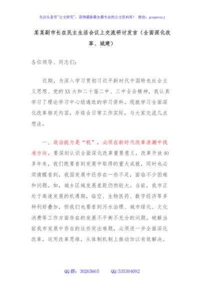 / 某某副市长在民主生活会议上交流研讨发言(全面深化改革、城建)