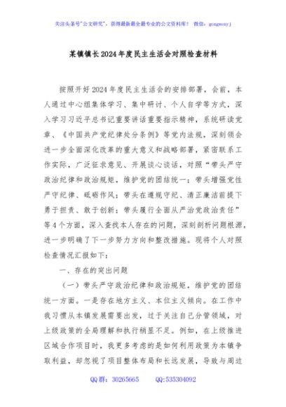 / 某镇镇长2024年度民主生活会对照检查材料