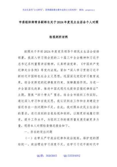 / 市委组织部常务副部长关于2024年度民主生活会个人对照检视剖析材料