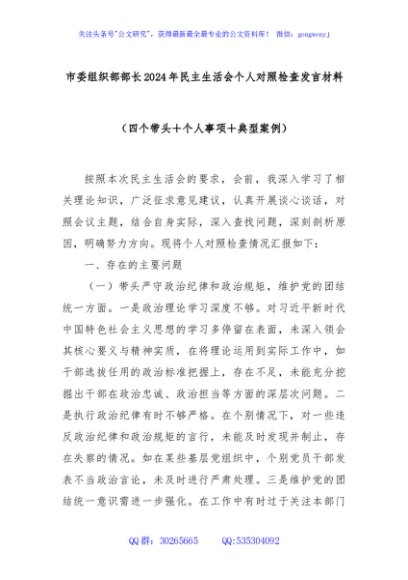 / 市委组织部部长2024年民主生活会个人对照检查发言材料(四个带头+个人事项+典型案例)
