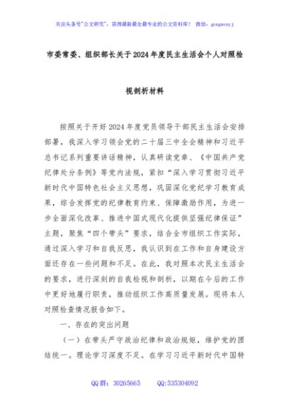 / 市委常委、组织部长关于2024年度民主生活会个人对照检视剖析材料