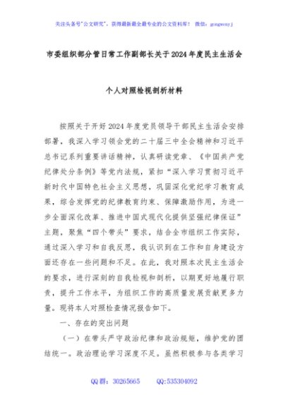 / 市委组织部分管日常工作副部长关于2024年度民主生活会个人对照检视剖析材料