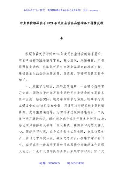 / 市直单位领导班子2024年民主生活会会前准备工作情况报告