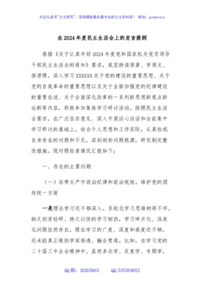 / 在2024年度民主生活会上的发言提纲