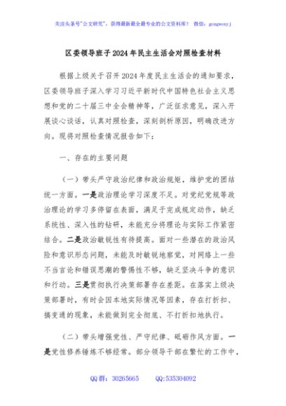 / 区委领导班子2024年民主生活会对照检查材料