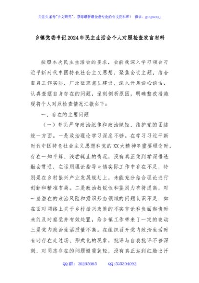 / 乡镇党委书记2024年民主生活会个人对照检查发言材料