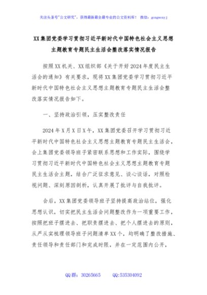 / XX集团党委学习贯彻习近平新时代中国特色社会主义思想主题教育专题民主生活会整改落实情况报告