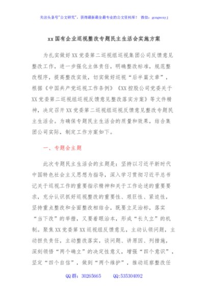 / xx国有企业巡视整改专题民主生活会实施方案