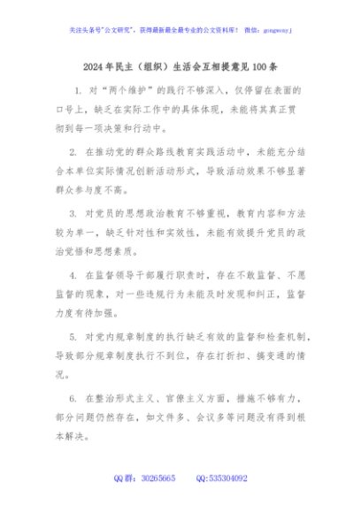 / 2024年民主(组织)生活会互相提意见100条