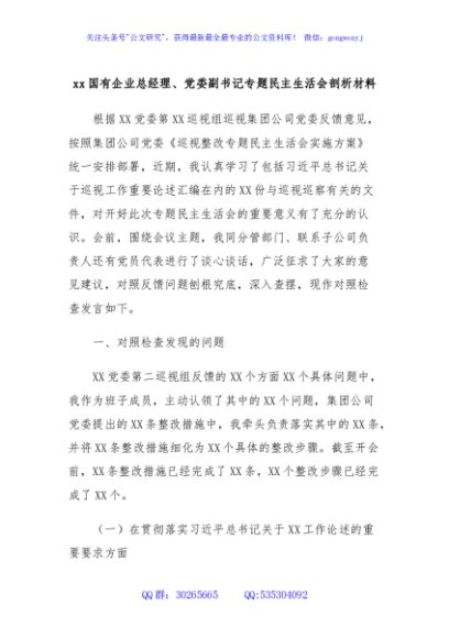 / xx国有企业总经理、党委副书记专题民主生活会剖析材料