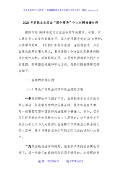 2024年度民主生活会前研讨发言提纲