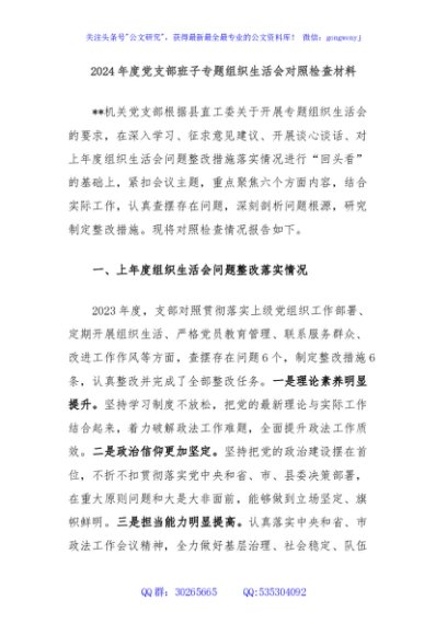 / 2024年度党支部班子专题组织生活会对照检查材料