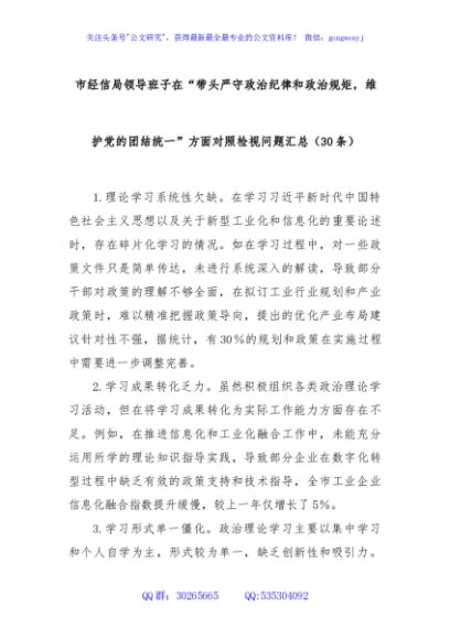 / (30条)市经信局领导班子在“带头严守政治纪律和政治规矩,维护党的团结统一”方面对照检视问题汇总