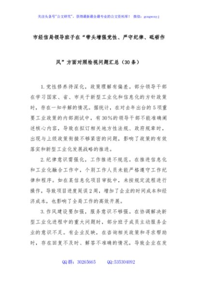 / (30条)市经信局领导班子在“带头增强党性、严守纪律、砥砺作风”方面对照检视问题汇总