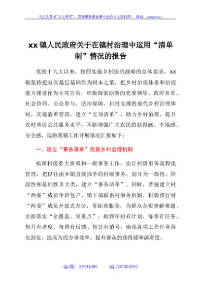 / xx镇人民政府关于在镇村治理中运用“清单制”情况的报告