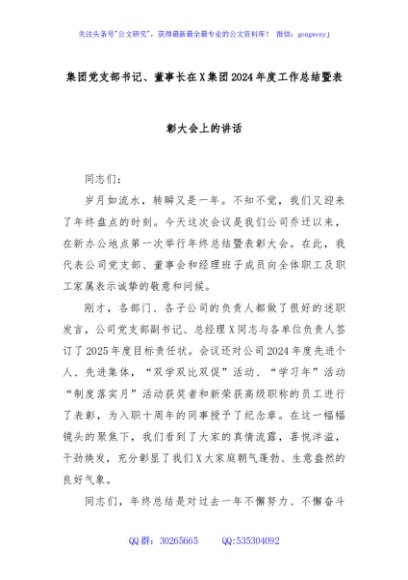 / 集团党支部书记、董事长在X集团2024年度工作总结暨表彰大会上的讲话