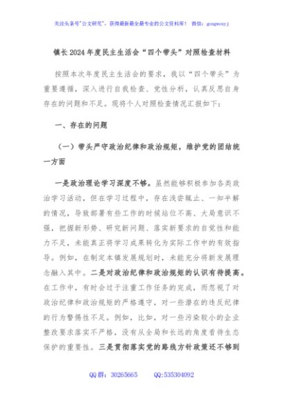 / 镇长2024年度民主生活会“四个带头”对照检查材料