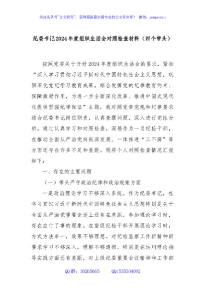 / 纪委书记2024年度组织生活会对照检查材料(四个带头)