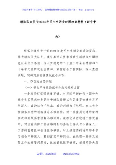 / 消防队大队长2024年民主生活会对照检查材料(四个带头)