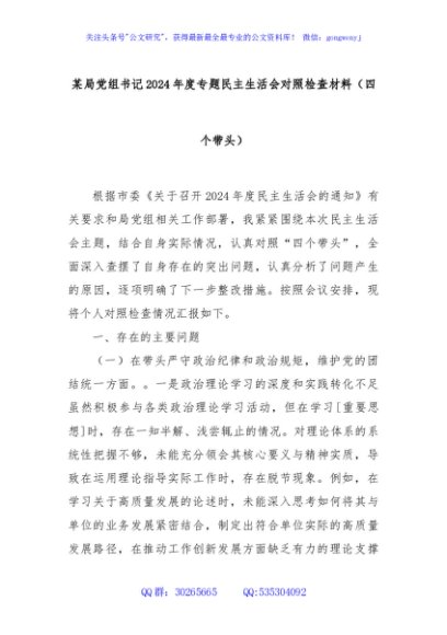/ 某局党组书记2024年度专题民主生活会对照检查材料(四个带头)