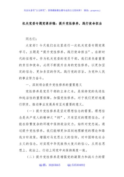 / 机关党委专题党课讲稿:提升党性修养,践行使命担当