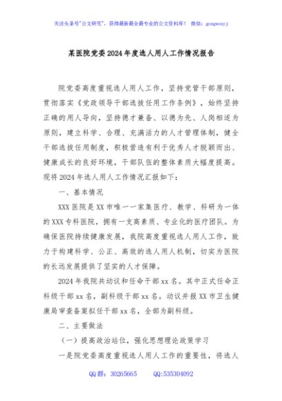 / 某医院党委2024年度选人用人工作情况报告