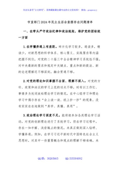 / 市直部门2024年民主生活会查摆存在问题清单