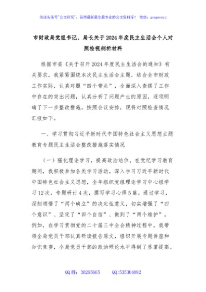 / 市财政局党组书记、局长关于2024年度民主生活会个人对照检视剖析材料