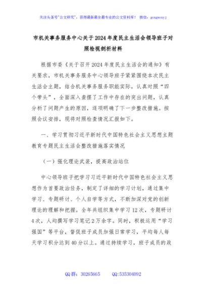 / 市机关事务服务中心关于2024年度民主生活会领导班子对照检视剖析材料
