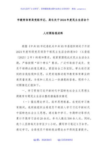 / 市教育体育局党组书记、局长关于2024年度民主生活会个人对照检视材料