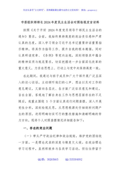 / 市委组织部部长2024年度民主生活会对照检视发言材料