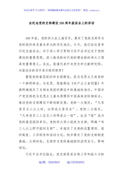 / 在纪念党的支部建设100周年座谈会上的讲话