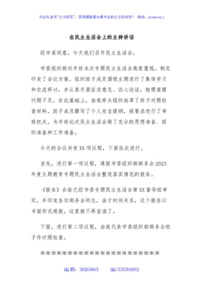 / 在民主生活会上的主持讲话