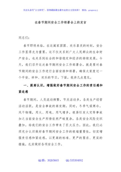 / 在春节期间安全工作部署会上的发言