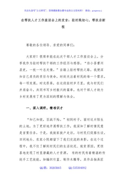 / 在帮扶人才工作座谈会上的发言:驻村践初心,帮扶启新程