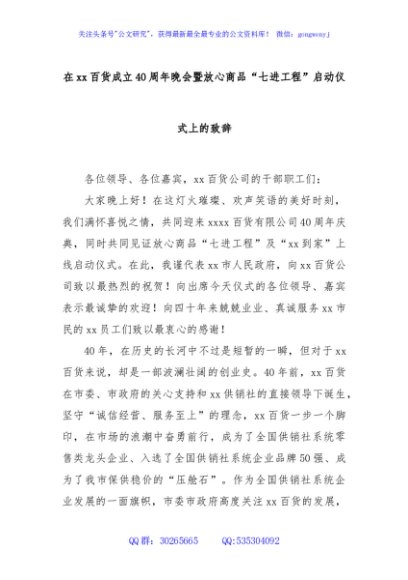 / 在xx百货成立40周年晚会暨放心商品“七进工程”启动仪式上的致辞