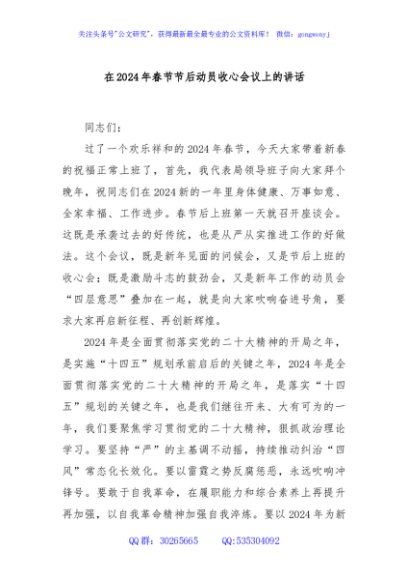 / 在2024年春节节后动员收心会议上的讲话