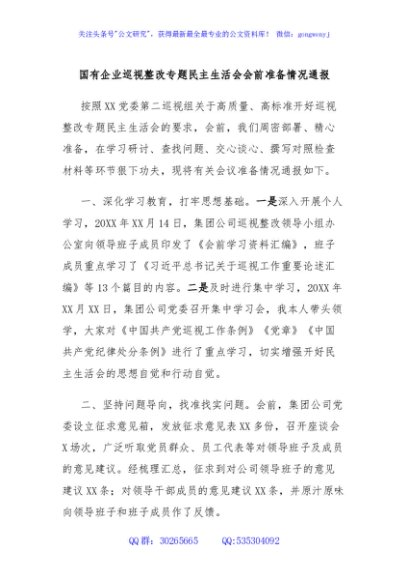 / 国有企业巡视整改专题民主生活会会前准备情况通报