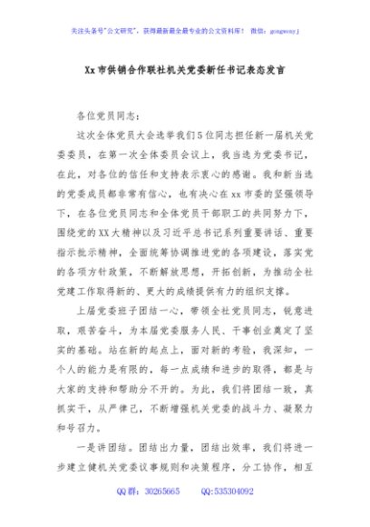 / Xx市供销合作联社机关党委新任书记表态发言