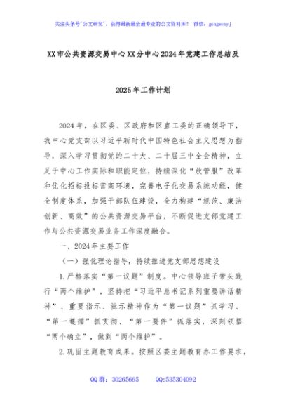/ XX市公共资源交易中心XX分中心2024年党建工作总结及2025年工作计划