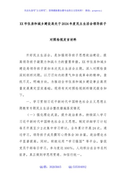 / XX市住房和城乡建设局关于2024年度民主生活会领导班子对照检视发言材料