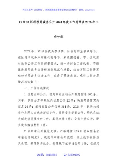 / XX市XX区科技局政务公开2024年度工作总结及2025年工作计划