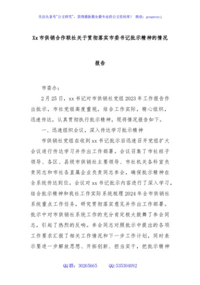 / Xx市供销合作联社关于贯彻落实市委书记批示精神的情况报告