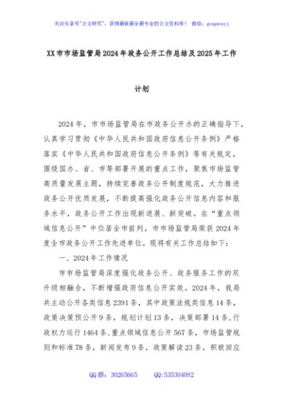 / XX市市场监管局2024年政务公开工作总结及2025年工作计划