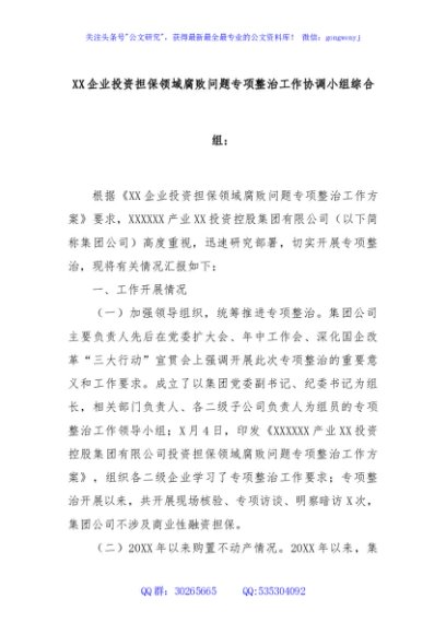 / XX企业投资担保领域腐败问题专项整治工作协调小组综合组