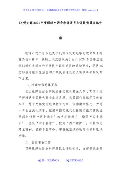 / XX党支部2024年度组织生活会和开展民主评议党员实施方案