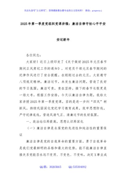 / 2025年第一季度党组织党课讲稿:廉洁自律守初心平平安安过新年