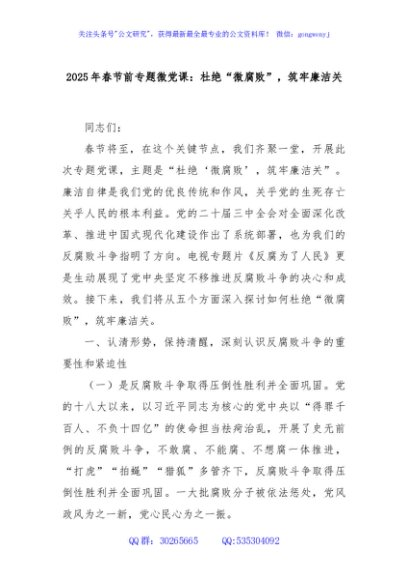 2025年春节前专题微党课:杜绝“微腐败”,筑牢廉洁关